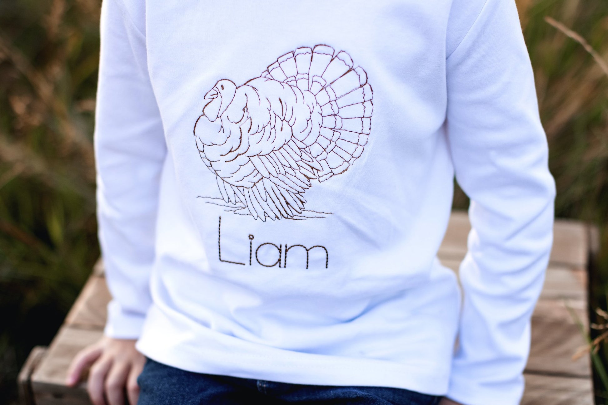 A simple embroidered turkey shirt that's perfect for Thanksgiving!