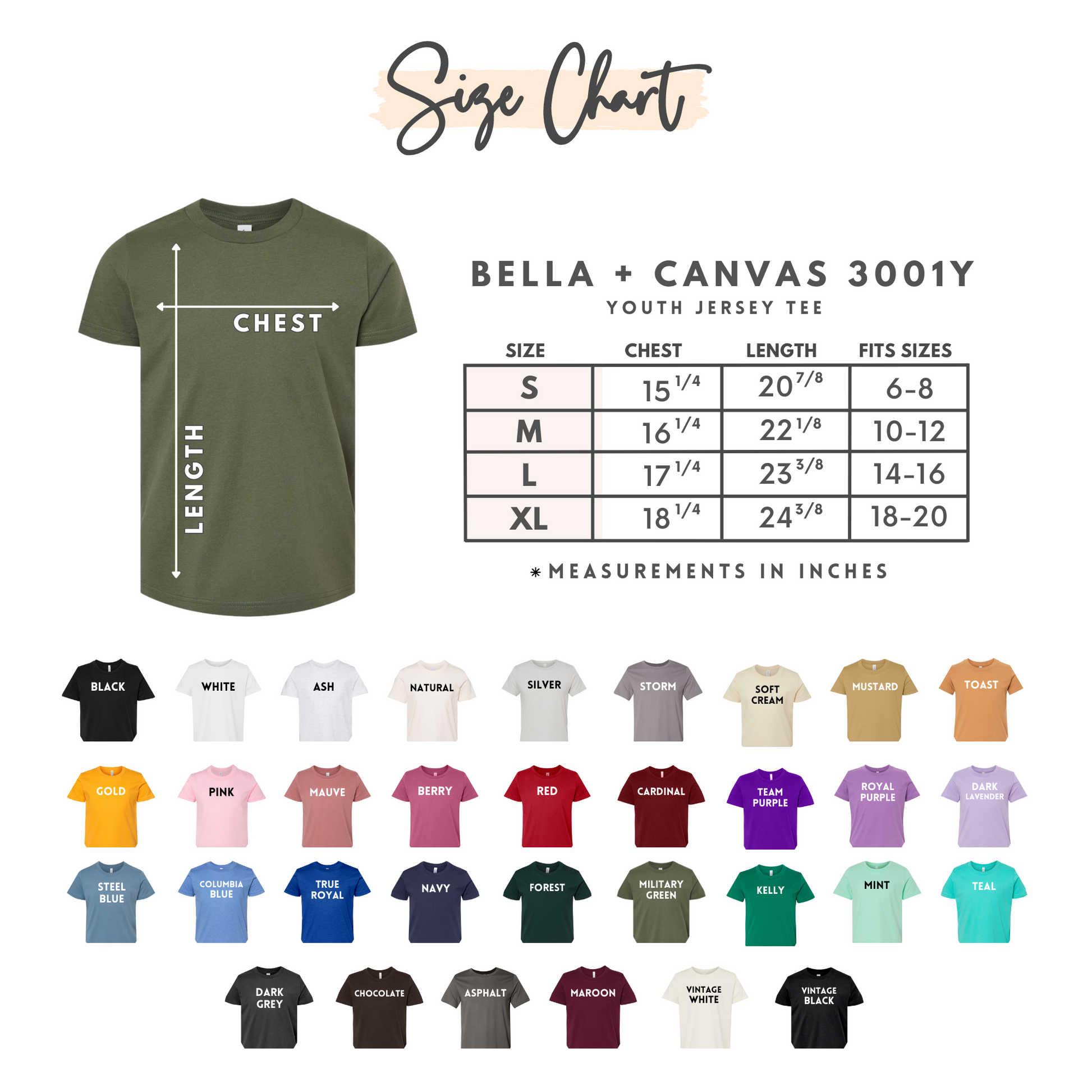Ruffle hem tees are available in 2T-12 and Bella Canvas is available in Youth S, M, L, and XL.