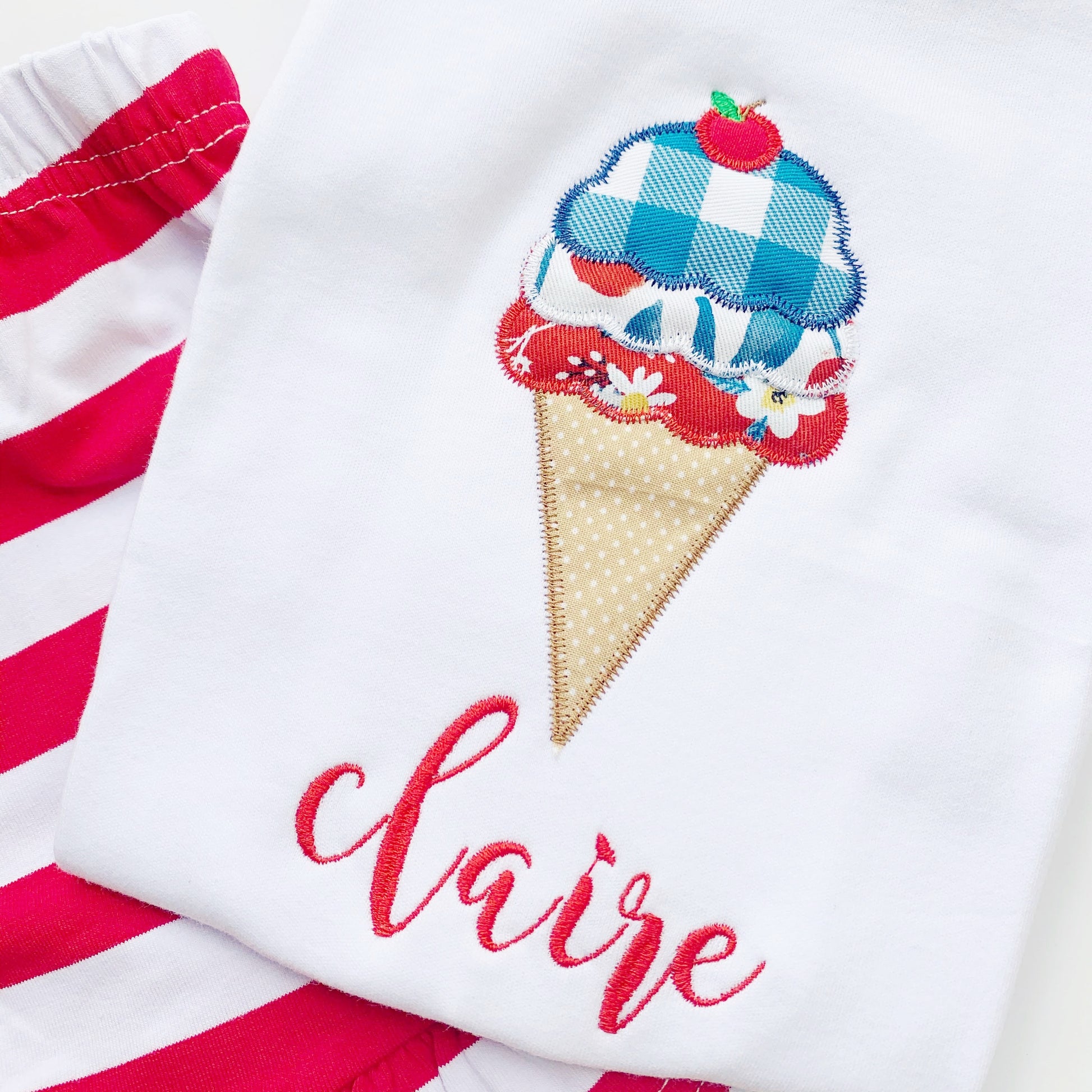 Give your little girl the perfect patriotic look with this Girls Patriotic Ice Cream Outfit! Featuring an adorable applique ice cream cone in red white and blue, it's the perfect look for the 4th of July (or any day!) - available with or without a pair of red stripe ruffle shorts for extra sweetness!