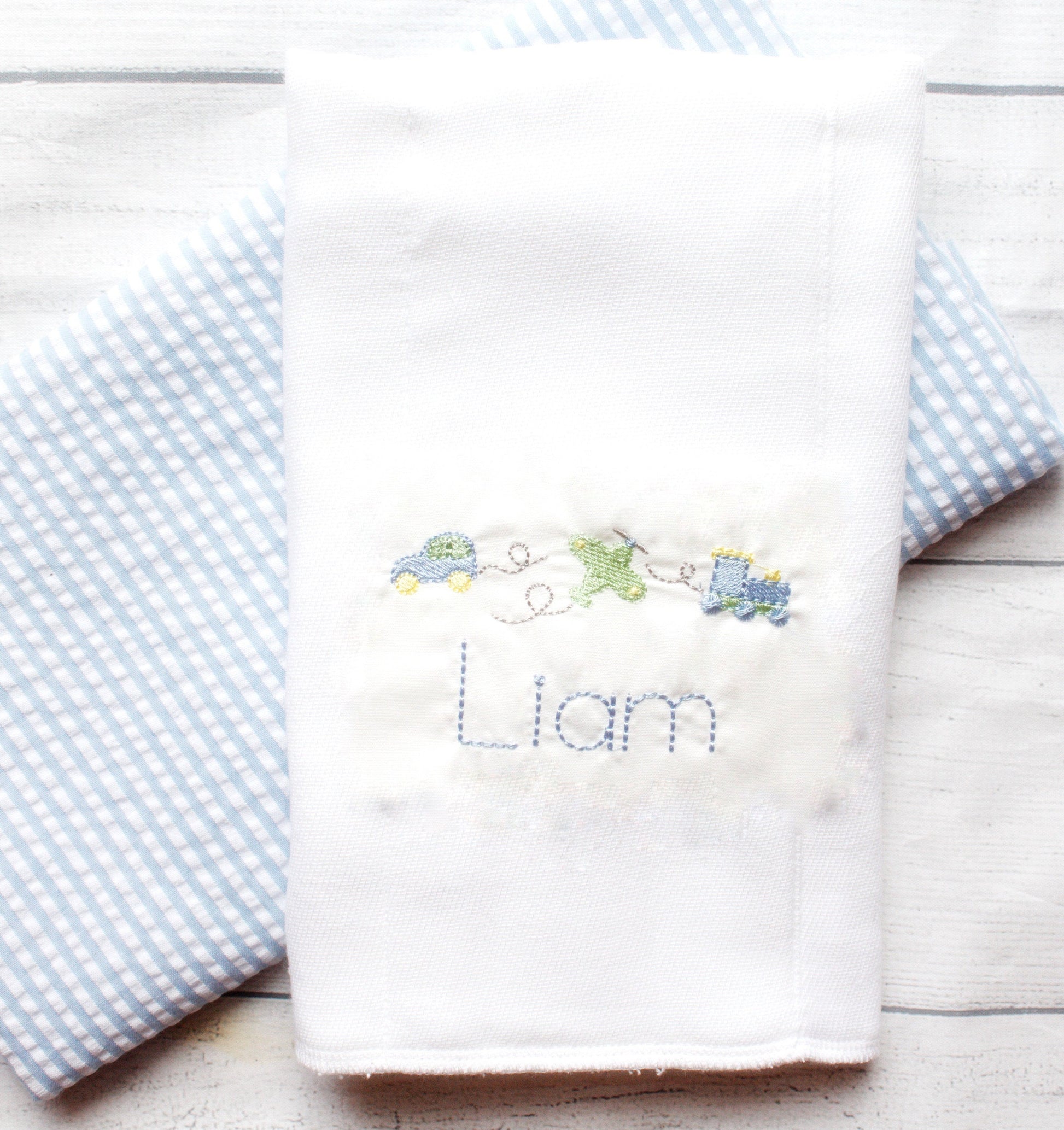 This set has an embroidered truck, train and airplane and the child's name stitched in blue.