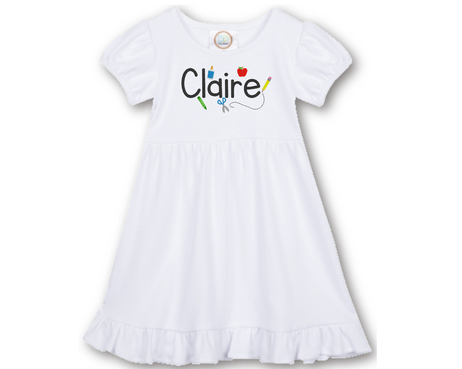 This is the sweetest dress for back to school! Made on a comfy, cotton ruffle dress that transitions from the classroom to recess perfectly.