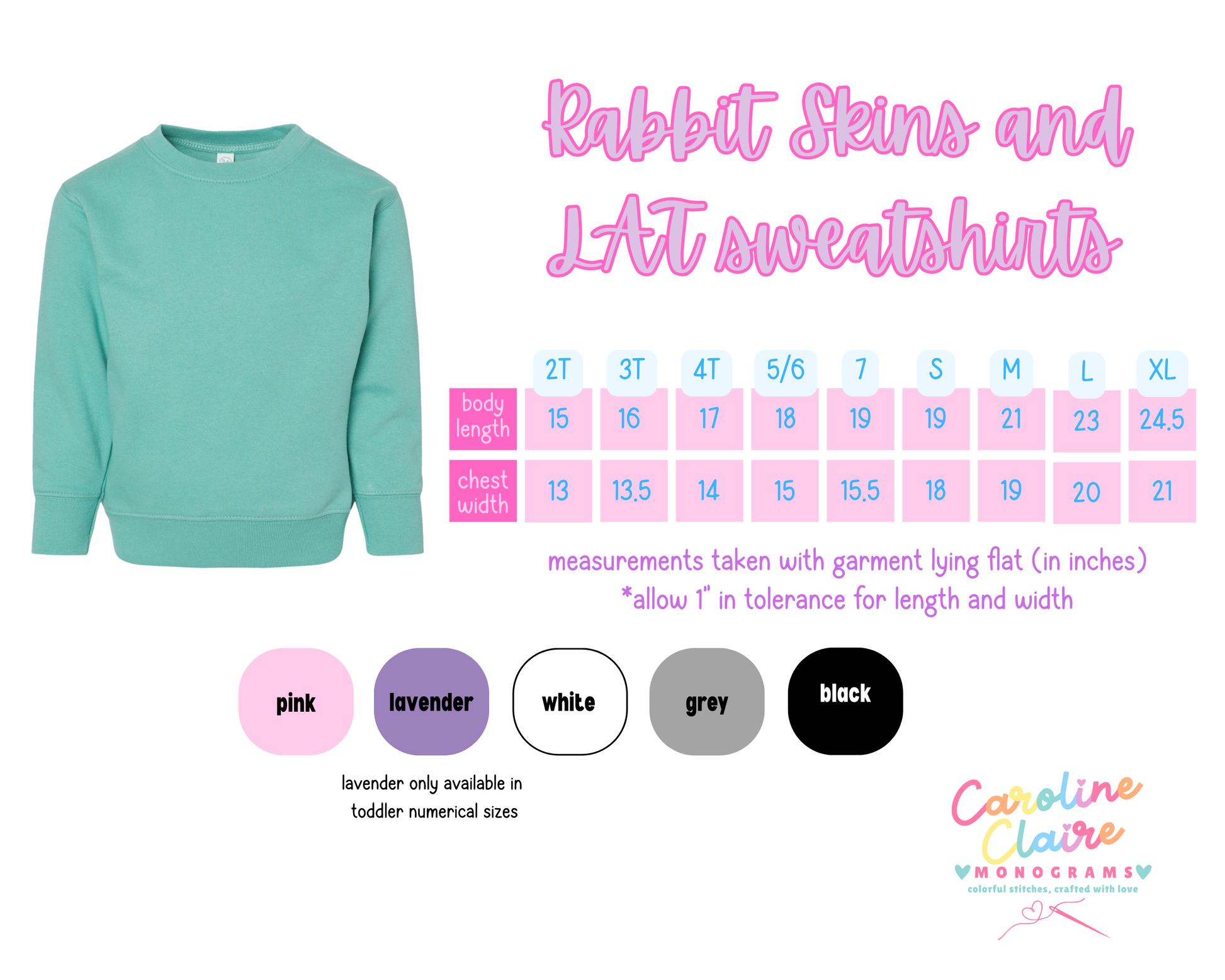 - Sweatshirt colors: Grey, Black, White, Pink, or Lavender (lavender available only in toddler numerical sizes 2T–7)