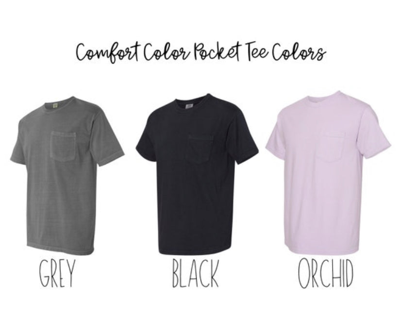 Short sleeve and long sleeve tees are Comfort Color Pocket Tees.